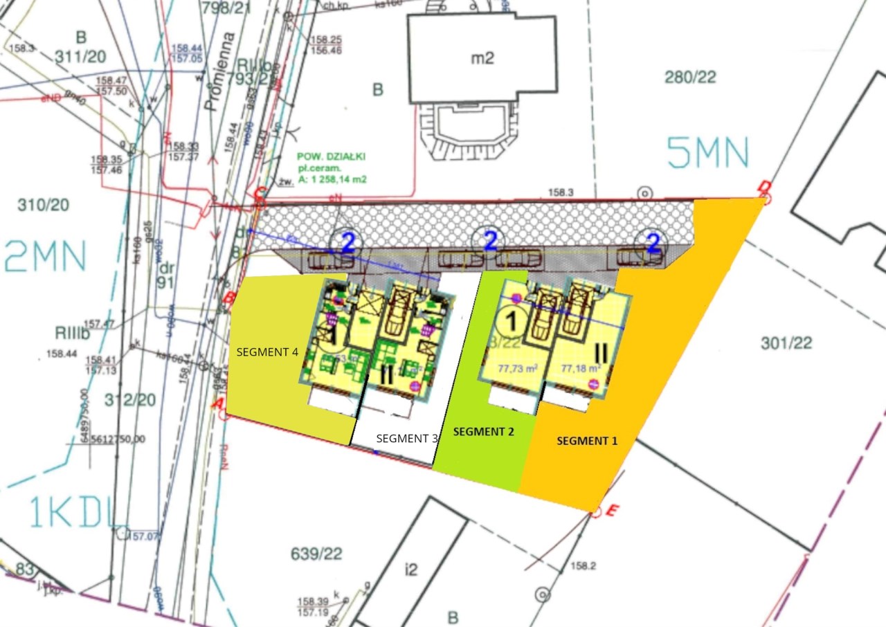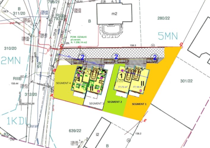 Oferujemy do zakupu segment lewy (segment 3) budynku dwulokalowego, posadowiony na pięknie nasłonecznionej działce o powierzchni około 2 ara. Inwestycja ma charakter kameralny, realizowana jest w cichej części Opola, w dzielnicy Chmielowice, przy luźno zabudowanej ulicy Promiennej (dojazd drogą asfaltową).