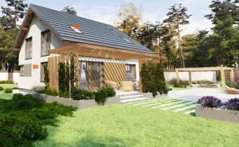 Z opisu projektanta: "Jagoda to uroczy dom z poddaszem użytkowym, który przy stosunkowo niedużej powierzchni oferuje bardzo bogaty program funkcjonalny. Parter to strefa dzienna z otwartą kuchnią i salonem, z którego wyjście prowadzi wprost do ogrodu. Na poddaszu zaplanowano trzy przytulne sypialnie oraz łazienkę. Dołączony garaż w bryle budynku zapewnia wygodę i dodatkową przestrzeń gospodarczą."
