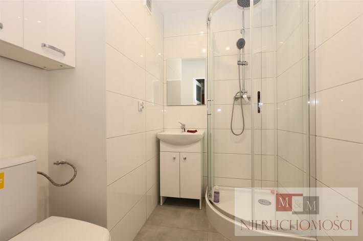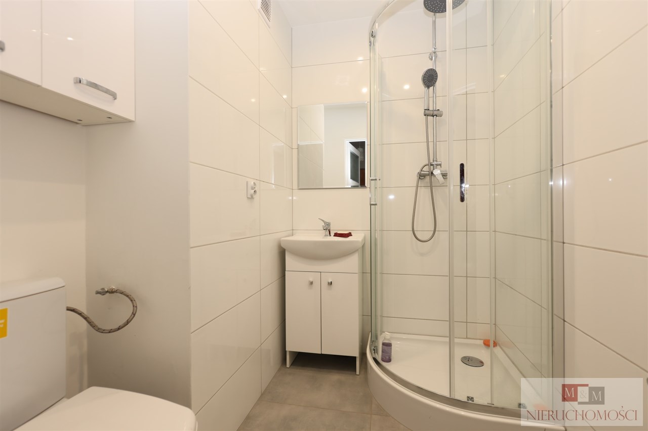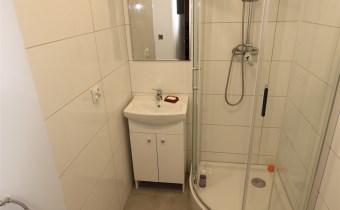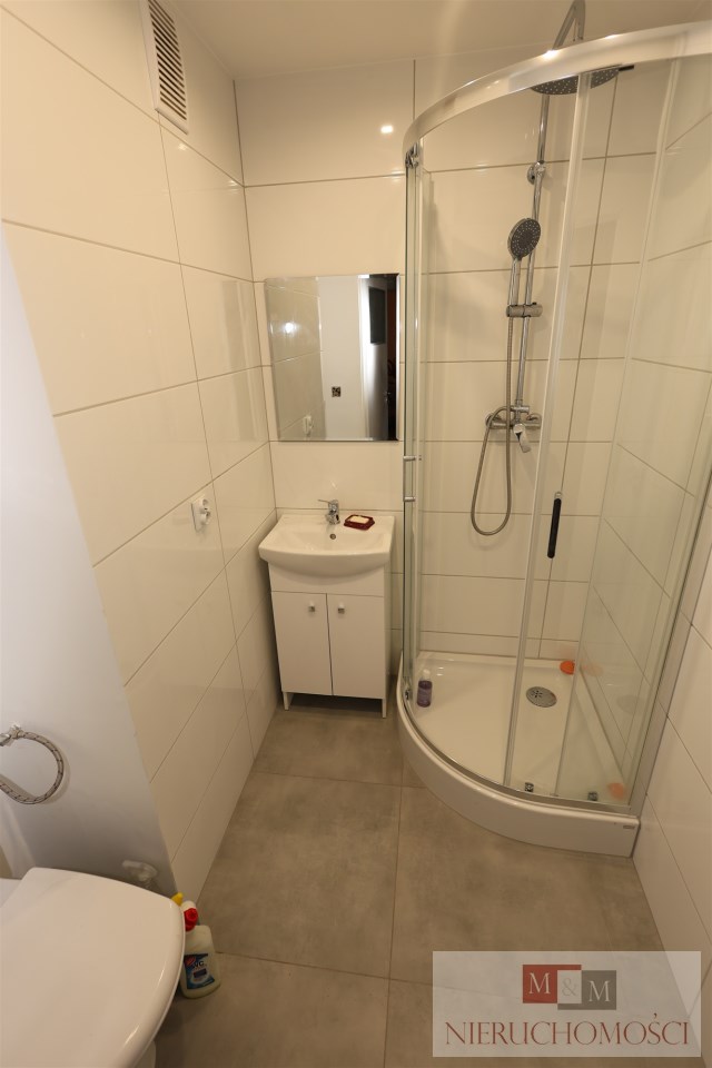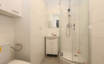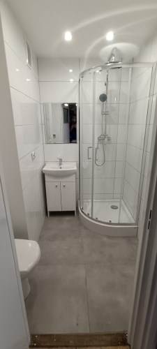 Łazienka po remoncie: Wykończona w jasnej kolorystyce, z nowoczesną kabiną prysznicową, umywalką z szafką oraz nową armaturą.