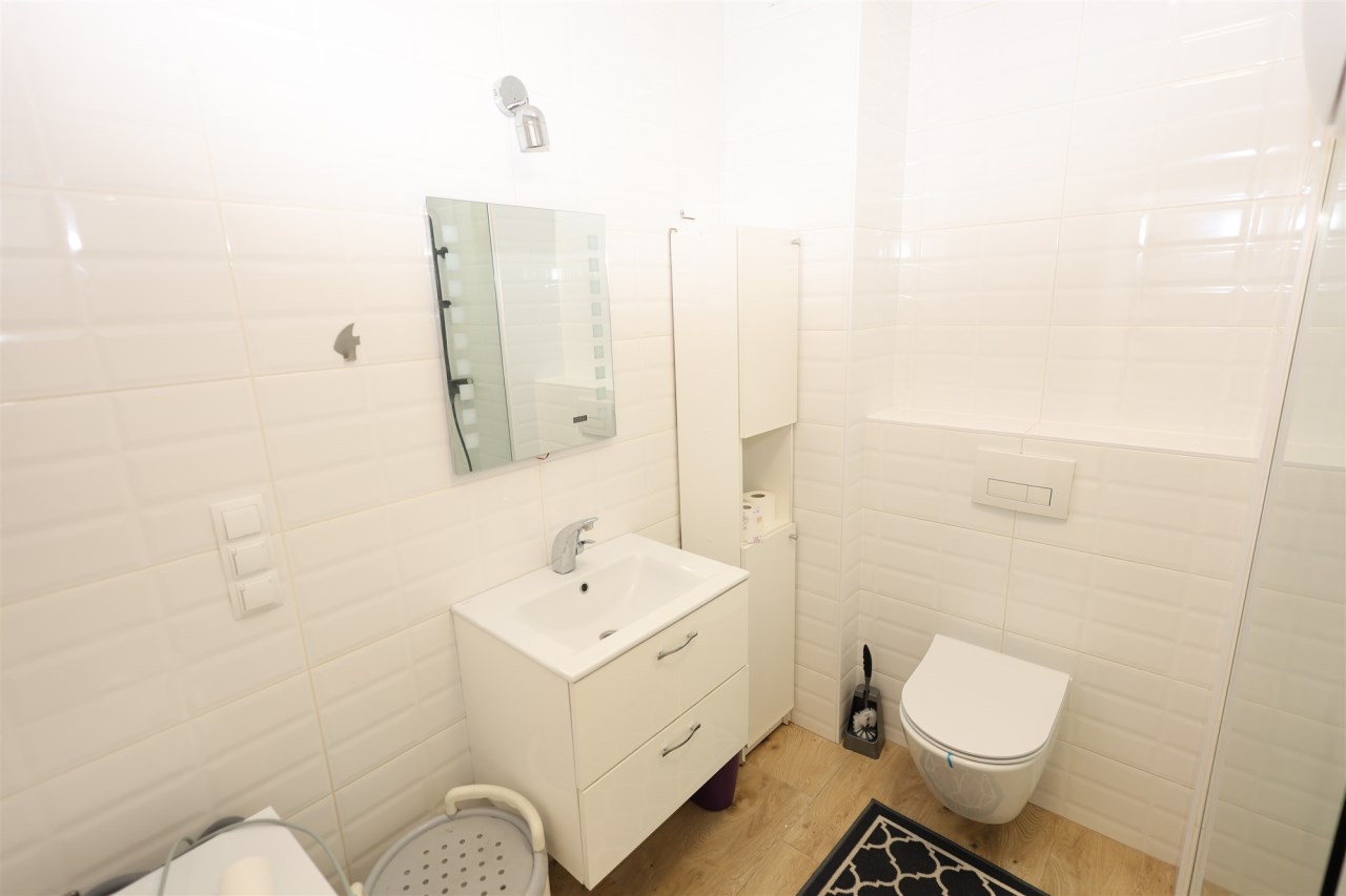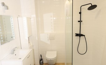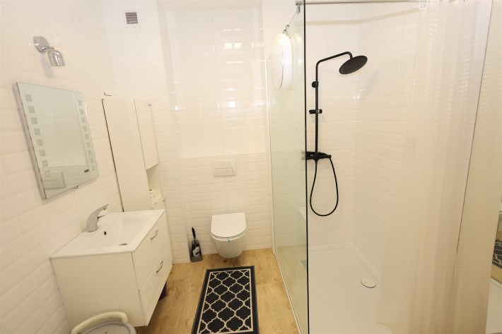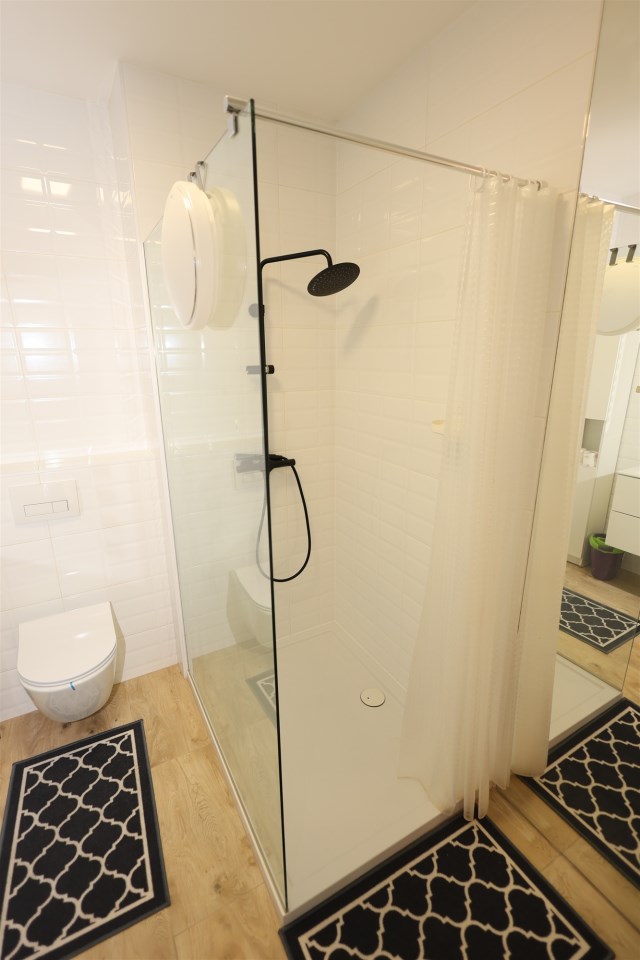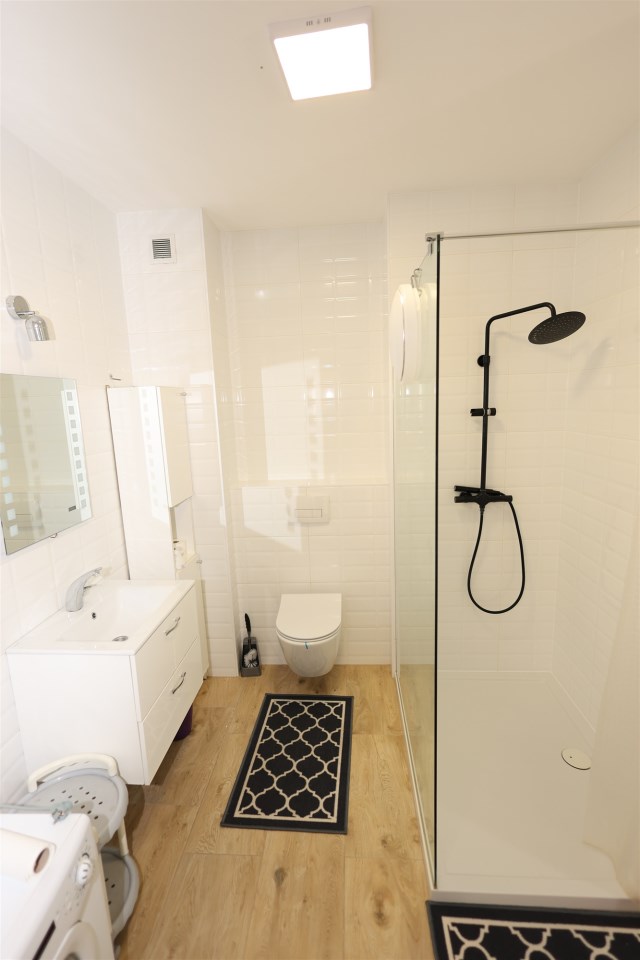 Łazienka: Nowoczesna, połączona z WC, wykończona materiałami wysokiej klasy.