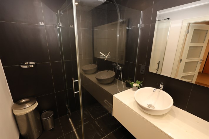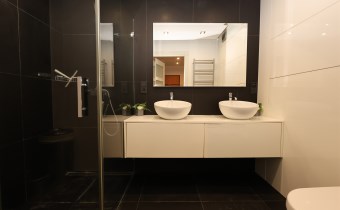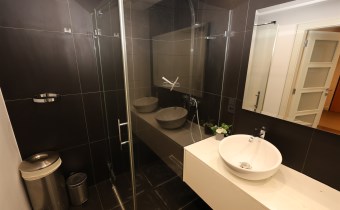 Nowoczesna łazienka: W pełni wykafelkowana, wyposażona w komfortowy prysznic.