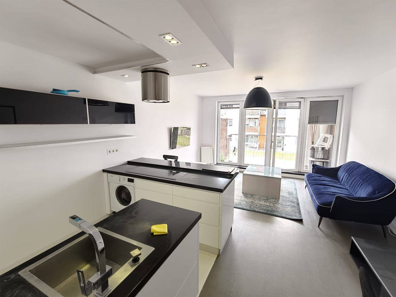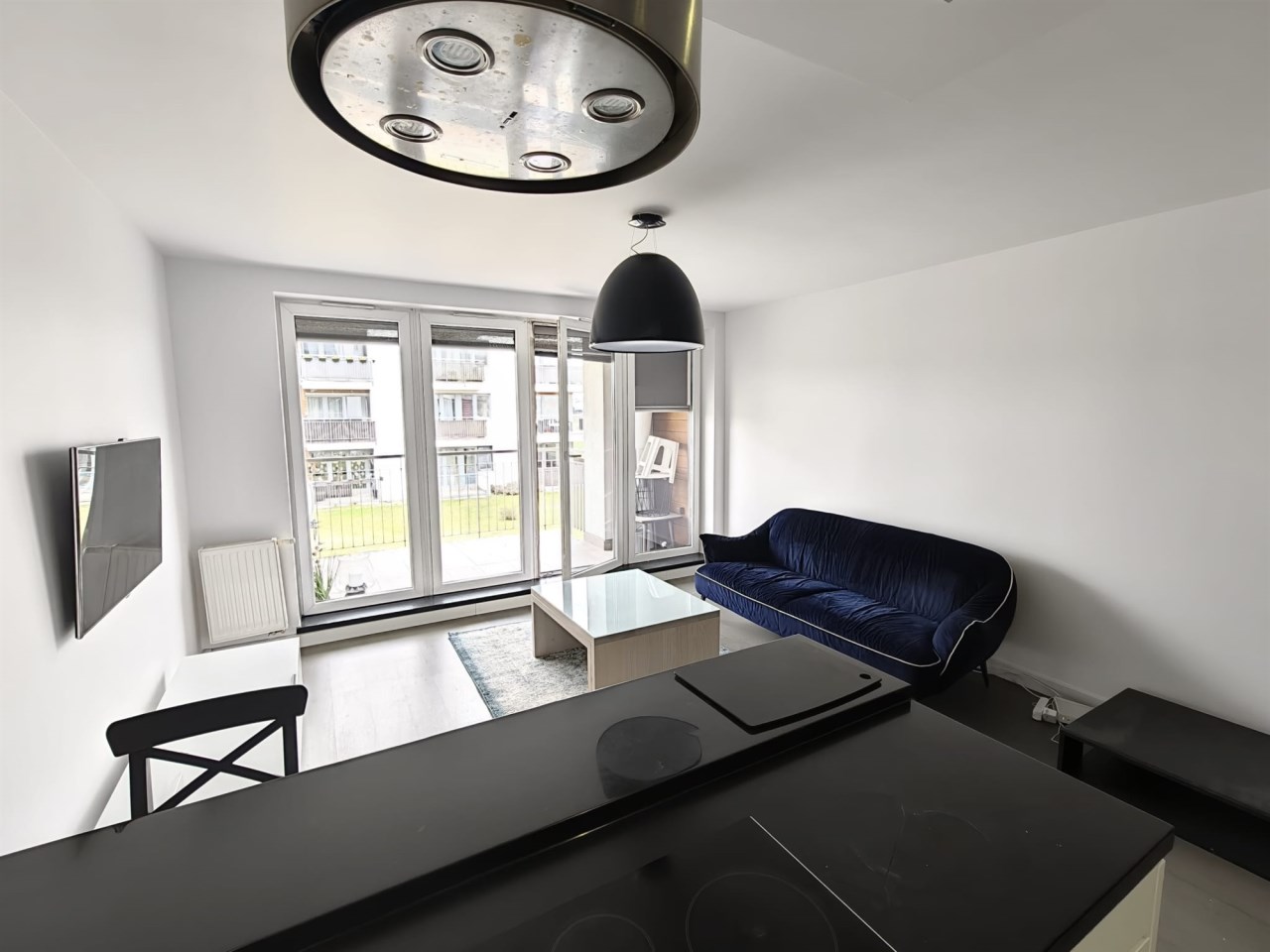 Przestronny salon z aneksem kuchennym: Serce domu z wyjściem na duży balkon – idealne miejsce na poranną kawę. Kuchnia w pełni wyposażona w sprzęt AGD.